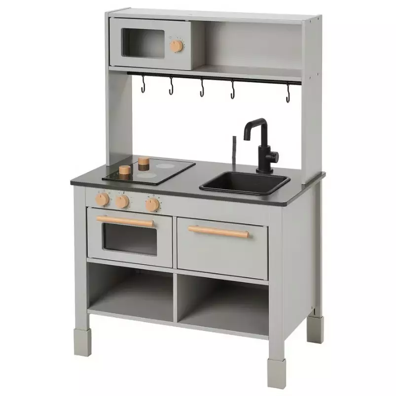 Leikkikeittiössä on mekaaninen liesi, jonka keittotasot muuttuvat punaisiksi jäljitelläkseen lämpöä lapsen kääntäessä nuppia. Keittiöön kuuluu myös mikroaaltouuni, tiskiallas, uuni ja tilaa pienille lelutarvikkeille.