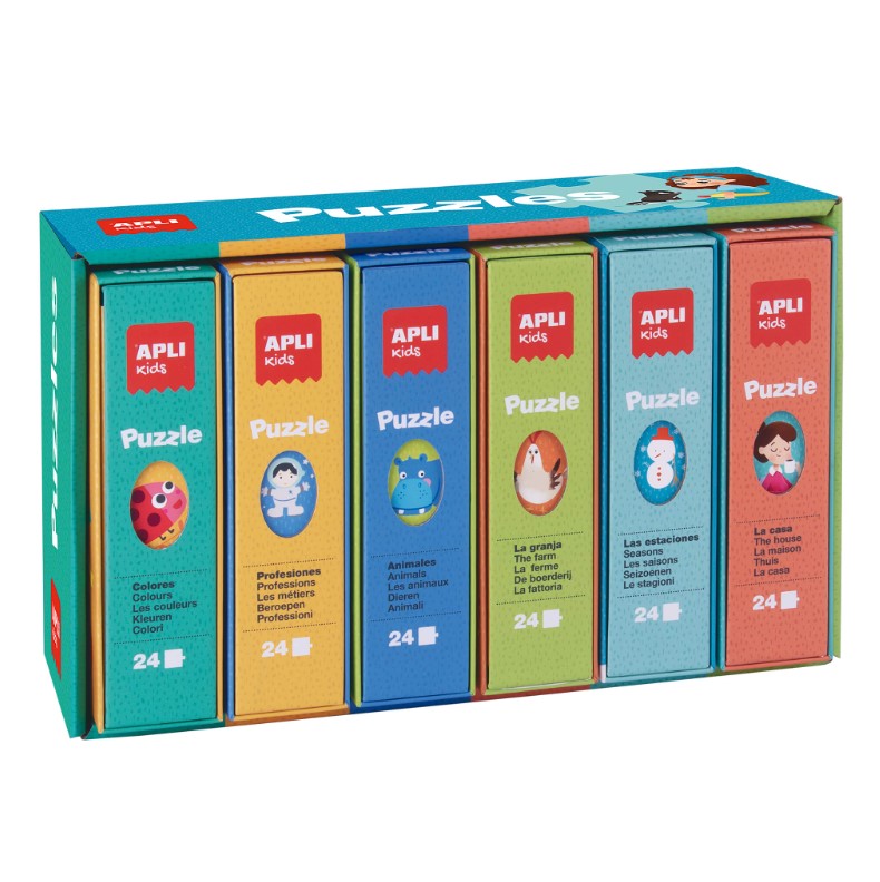 Kuusi iloisen väristä palapeliä yksittäisissä kartonkirasioissa, jotka on pakattu kätevään säilytyslaatikkoon. Säilytyslaatikon voin sijoittaa vaikkapa kirjahyllyyn, jossa palapelit pysyvät siistissä järjestyksessä ja niistä on helppoa valita mieluinen päädyn kuvauksen perusteella. Jokaisella palapelillä on oma opettavainen teemansa. Palapelin kuvat ovat kauniisti piirrettyjä ja täynnä mielenkiintoisia yksityiskohtia. Jokaisessa palapelissä on 24 palaa, mutta palapelin muoto vaihtelee. Paloja on helppo käsitellä kokonsa (7 x 7 cm) sekä pyöristettyjen kulmien ansiosta.