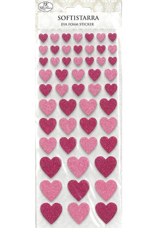 Pehmeät sydämenmuotoiset tarrat askarteluun ja koristeluun. Tarroissa glitteriä.