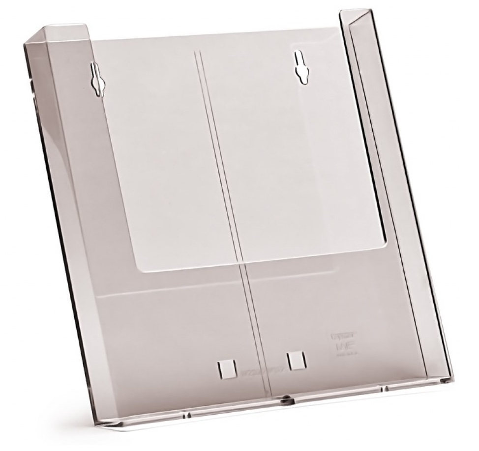 Sisälle mahtuu 3,2 cm esitteitä yms. Hakusanat: seinäteline, pöytäteline, esiteteline, lehtiteline, lehtikotelo.
