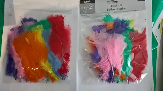 Höyhenet värilajitelma 10cm rautalangalla vihreä, oranssi, violetti, v.sininen, v.punainen, punainen ja keltainen n. 45kpl/pss, 10-13g