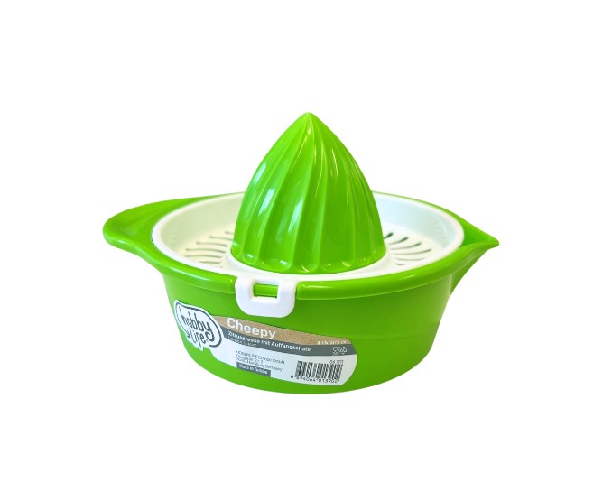 Perinteinen mekaaninen sitruspuristin. Neljä värivaihtoehtoa: vihreä (kuvassa), kirkkaanpunainen, turkoosi ja vaaleanharmaa. Väri valikoituu tilaukselle sattumanvaraisesti.