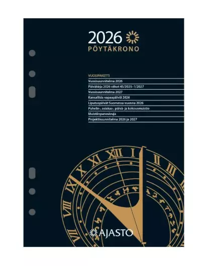 Koko 148 x 210 mm (A5); kuusirenkaisen mekanismin reiät; aukeamalla viikkonäkymä; päiväkirja 45/2025 - 1/2027; vuosisuunnitelmat 2026 ja 2027; suomalaiset nimipäivät; kansalliset vapaapäivät; puhelin-, asiakas-, päivä- ja kokousmuistiosivut; runsaasti muistiinpanotilaa; sopii myös Project365- ja Timex Space kansiin; FSC®-sertifioitu tuote.