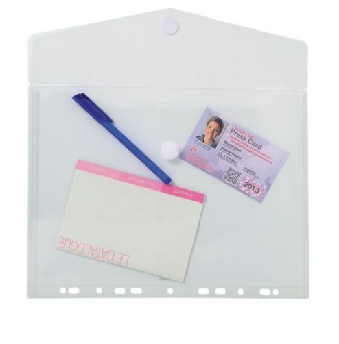 Läppä pitkällä sivulla, tarrasuljenta. Kansiorei'itys. Tukeva PP 0,17.