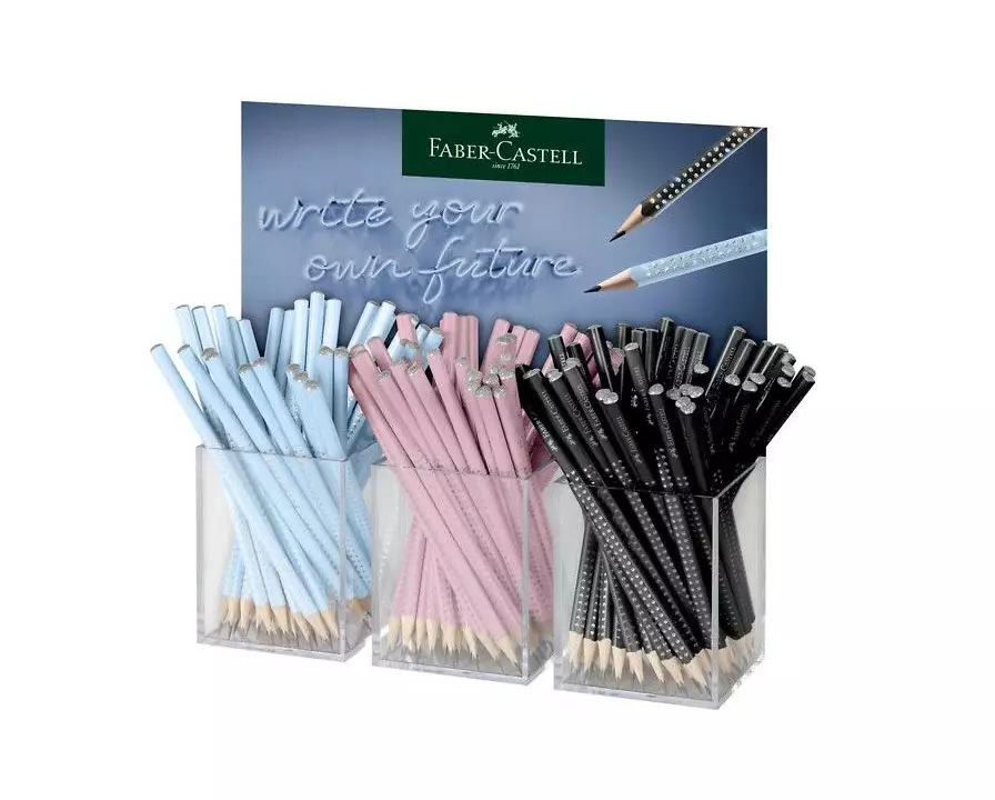 Faber-Castellin moderni lyijykynä kauniisti kimaltavilla yksityiskohdilla. Faber-Castellin lyijykynä on ergonomisesti muotoiltu kolmikulmaisen varren ansiosta. Kaikki Faber-Castellin lyijykynien lyijyt ovat murtumattomia, koska lyijy liimataan kynään kiinni. Lyijykynän kovuus on B. Hinta sisältää yhden kynän jonka väri valikoituu tilaukselle satunnaisesti sen hetkisten varastosaldojen puittessa.