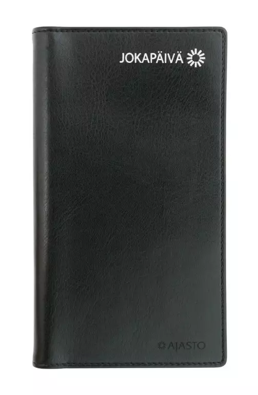Koko 85 x 162 mm; leatherette-kannet; parikierresidottu; aukeamalla pystyviikko; päiväkirja 47/2025–2/2027; vuosisuunnitelmat 2026 ja 2027; liputuspäivät Suomessa; suomalaiset nimipäivät; kansalliset vapaapäivät; auringon nousu- ja laskuajat (Helsinki, Oulu); kuun- ja auringonpimennykset; tietoja Suomesta ja EU:sta; välimatkataulukko; kynänpidike; Avainlippu-tuote; FSC®-sertifioitu tuote.