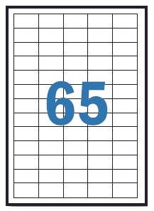 - Valkoinen A4 tulostustarra jaettu 65 tarraan, mitoiltaan 38 x 21,2 mm.
