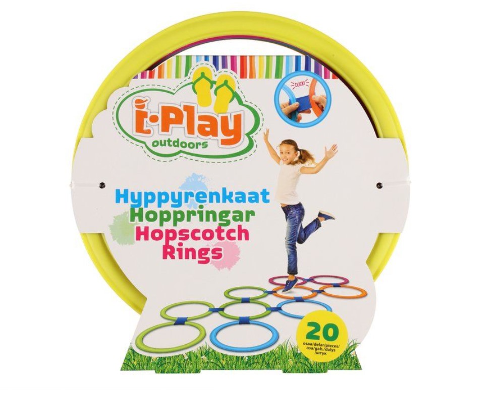 10 kpl värikkäitä ruutuhyppelyrenkaita ja 10 kiinnikettä. Helppo koota. Mukava ulkoleikki koko perheelle. Ikäsuositus 3+.
