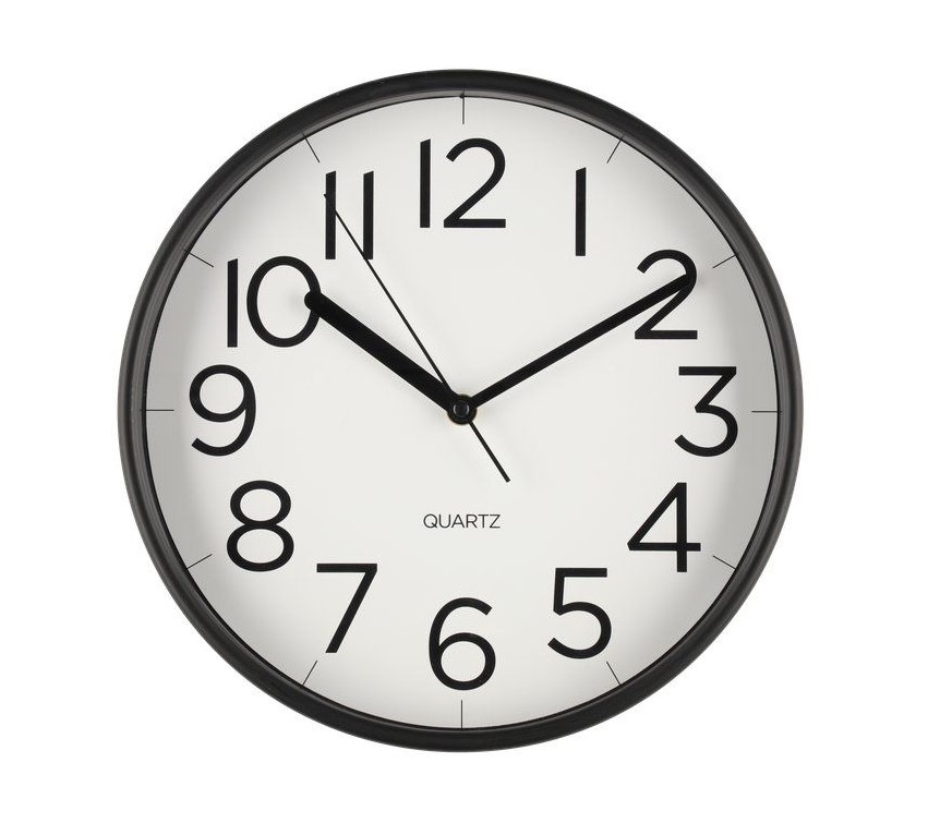 Klassinen seinäkello selkeillä numeroilla. Musta muovikehys. Valkoinen tausta mustilla numeroilla. Hiljainen koneisto.