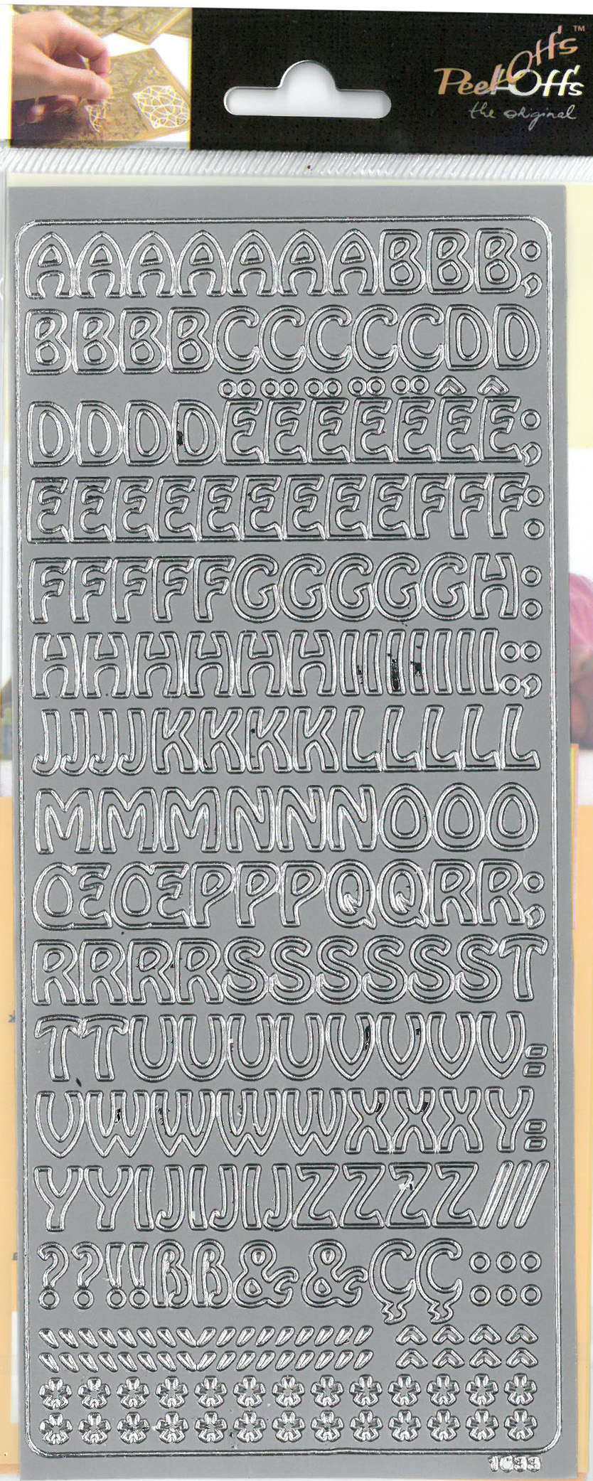 Hopeanvärinen ääriviivatarra isot kirjaimet. Pakkauksessa 1 arkki. Materiaali muovi. Happovapaa. Tuotteen koko: 26,3 x 11,2cm.