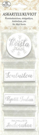 ASKARTELUKUVIOT Jouluteksti hopea Askartelukuviot korttiaskarteluun, skräppäilyyn ja koristeluun. Pakkauksessa 6kpl/kuvio. Kuvioissa kultaista folioprinttiä. Materiaali kartonki. Pakkauskoko: 26,5... Lue lisää