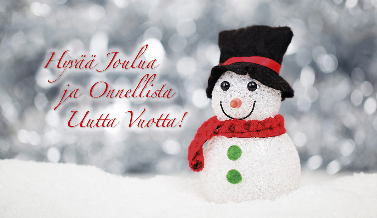 Joulukortti, jossa hymyilevä lumiukko koristaa korttia.