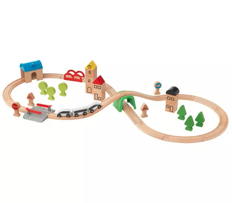 Lasten kolmiosainen puinen juna, jonka vaunut kiinnittyvät toisiinsa magneetein.