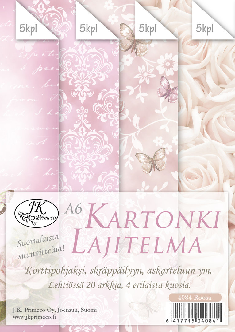 A6 kartonkilajitelma askarteluun ja koristeluun, 230g. Sopii myös suoraan korttipohjaksi. Pakkauksessa 20 arkkia/4 eri kuosia. Tuotteen koko: 14,8 x 10,5cm.