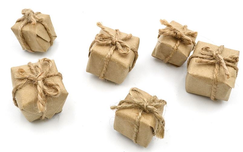Pienet koristepaketit minimaailman rekvisiitaksi tai koristeiksi. Pussissa 6 kpl paketteja. Isompi paketti 2,5cm ja pienempi 2cm.