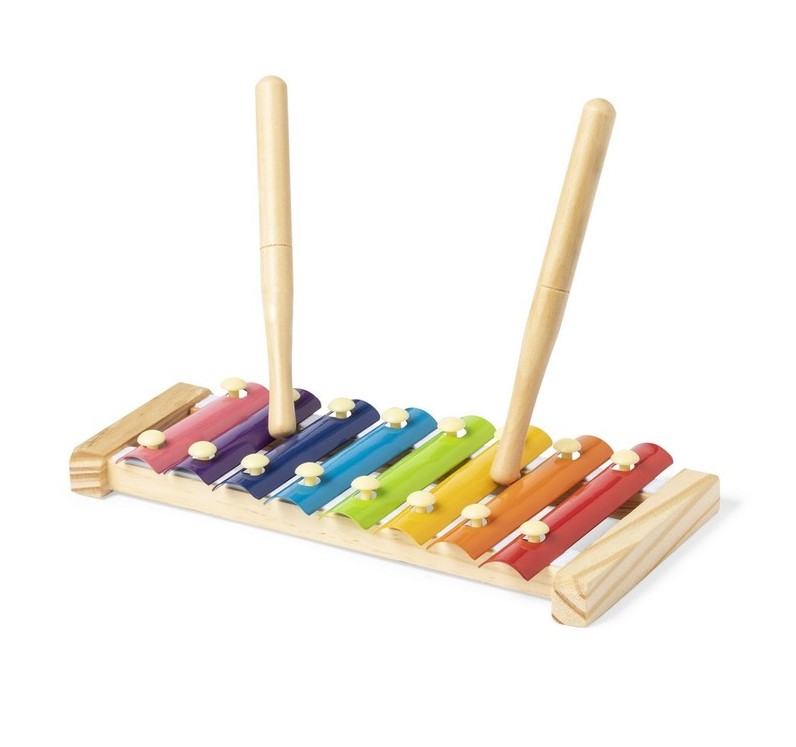 Värikäs puinen ksylofoni, jossa metalliset soittopalat. Mukana puiset soittokapulat.