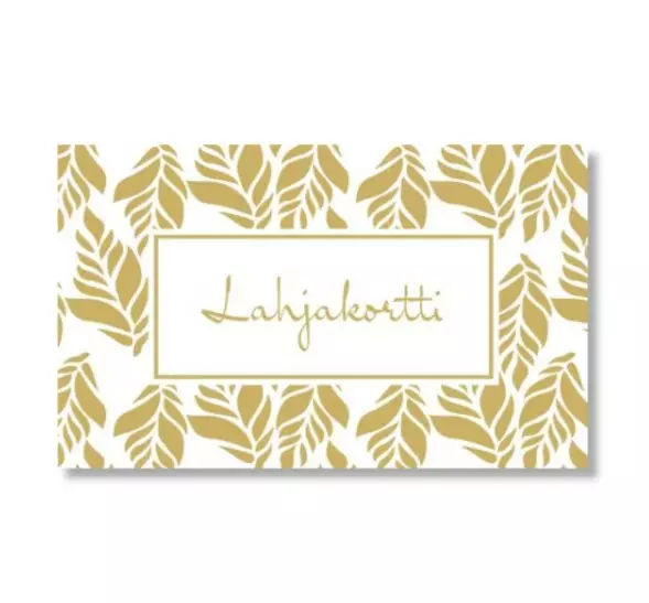 Kaksiosainen lahjakortti, jossa mukana kirjekuori. Kortin kannessa kaunis kultafolioitu kuviointi.