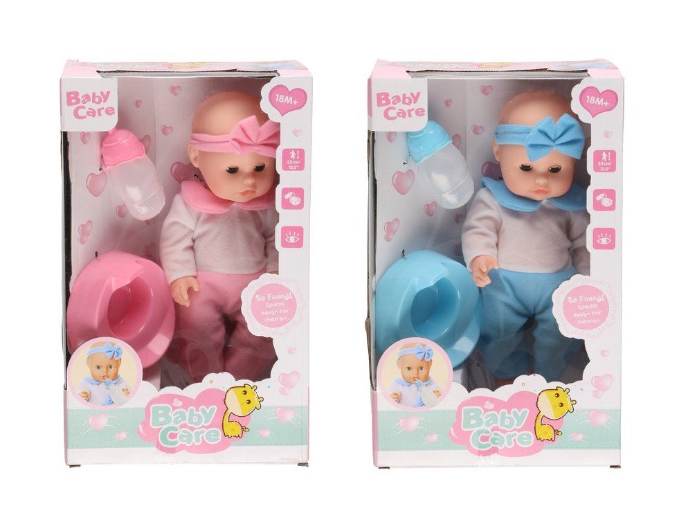 30 cm vauvanukke. Setissä potta ja juomapullo. Nukke juo ja pissaa.