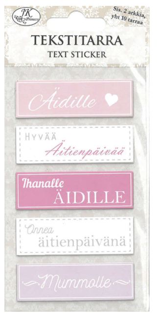 Tekstitarra korttiaskarteluun ja koristeluun. Pakkauksessa 2 arkkia, 5 tarraa/arkki. Yhden tarran koko 1,9 x 6cm. Materiaali kartonki. Tuotteen koko: 16,5cm x 8cm.