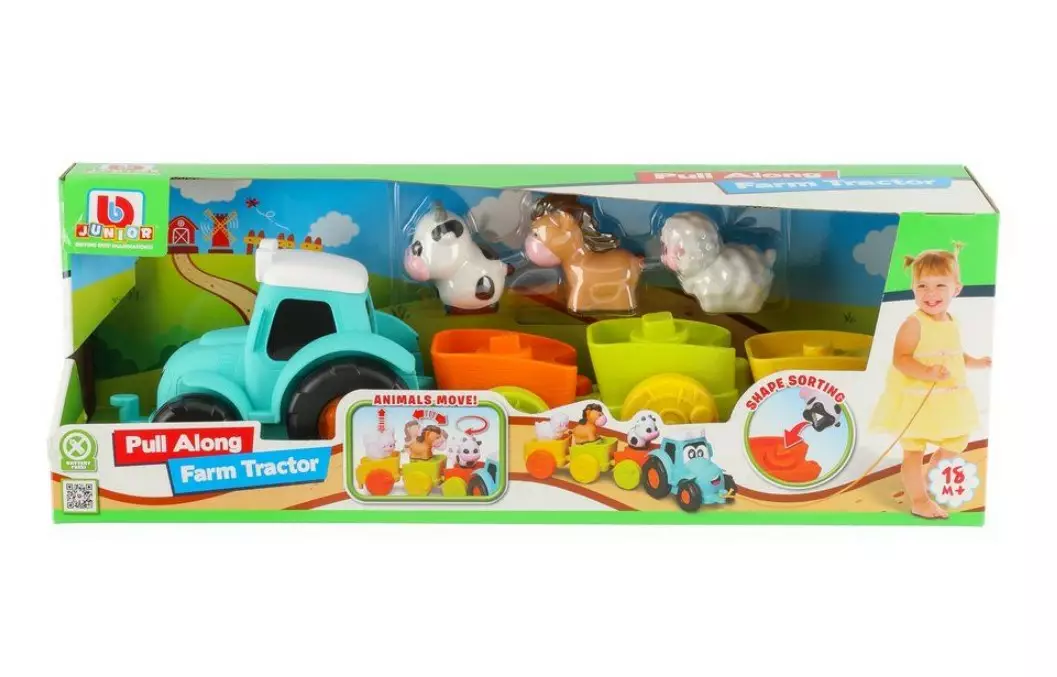 38 cm -pitkä vedettävä traktori, jonka perässä kolme perävaunua, joista jokaisen kyydissä maatilaneläin.