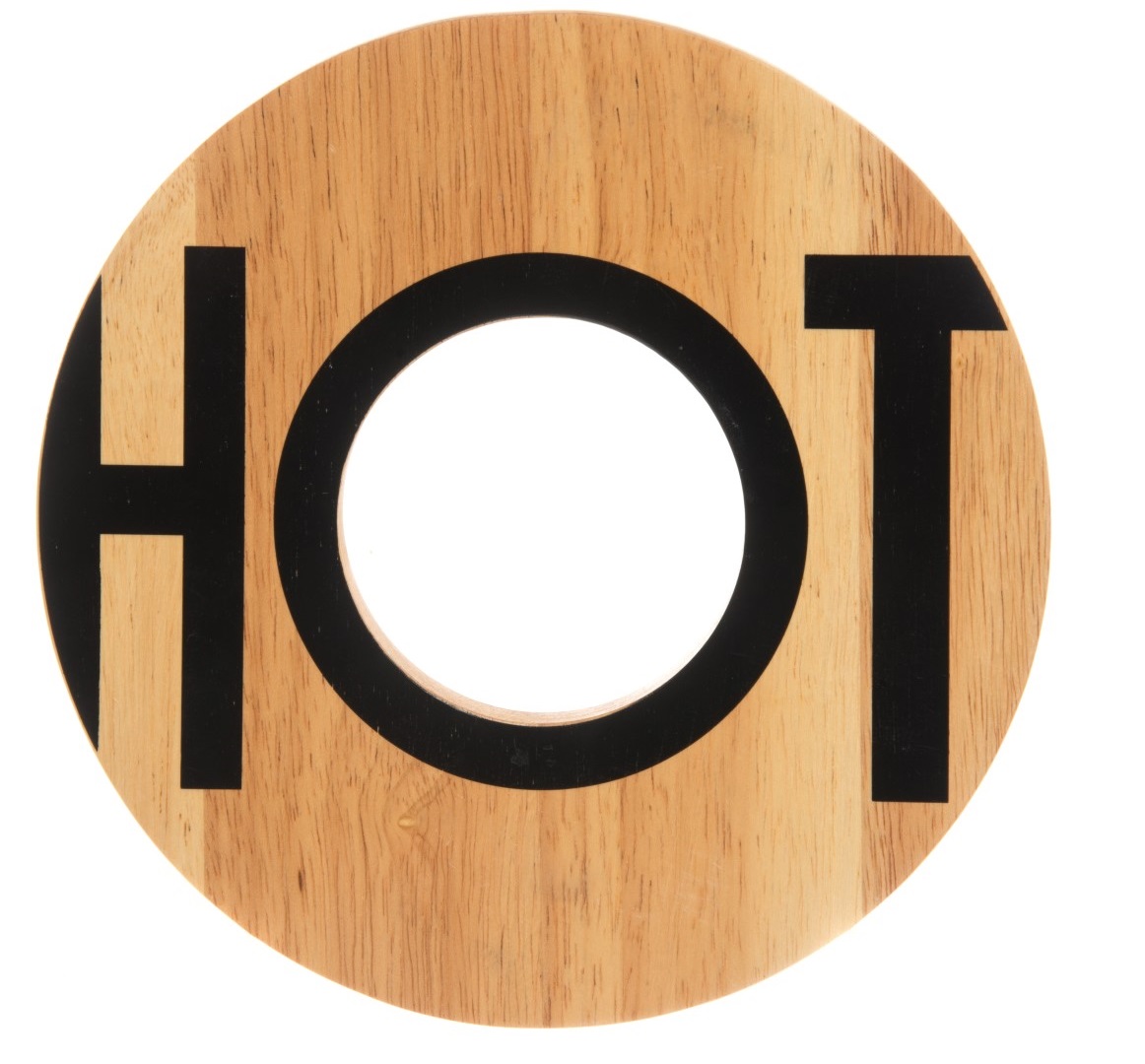 Kumipuusta valmistetttu pannunalunen Hot-tekstillä. Koko 20 x 1,2 cm. Käsinpesu. Hakusanat: pannualusta