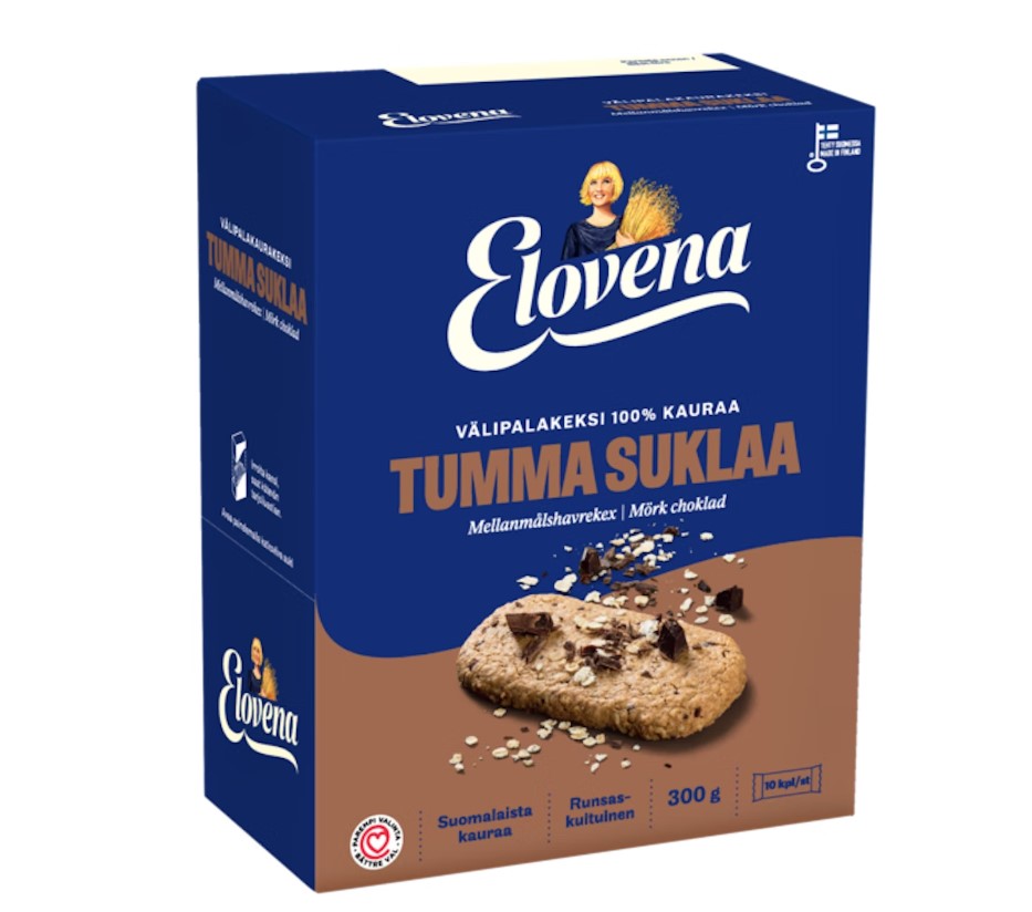 Elovena Tumma Suklaa Välipalakeksissä on suklainen maku ja se sisältää runsaasti kuitua. Täysjyväkeksin vilja on 100% kauraa ja keksi on leivottu rypsiöljyllä.