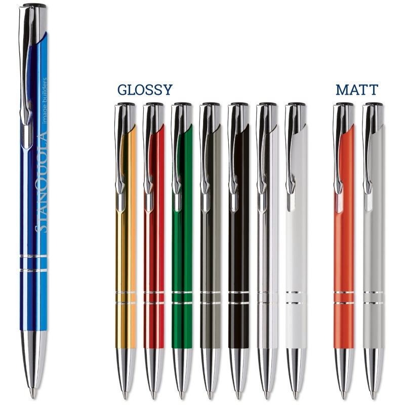 Elegantti alumiinikynä, jossa kaksi somisterengasta. sininen muste. hintaan sisältyy laserkaiverrus. Saatavilla 9 eri värissä.