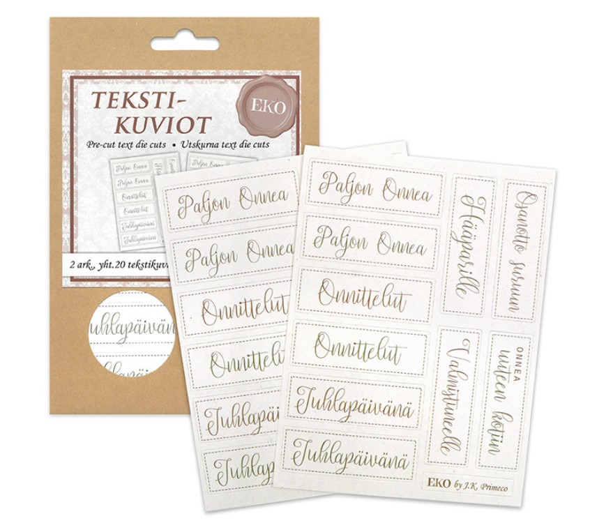 Tekstikuviot korttiaskarteluun, skräppäilyyn ja koristeluun. Pakkauksessa kaksi erilaista arkkia, yhteensä 20 tekstikuviota.