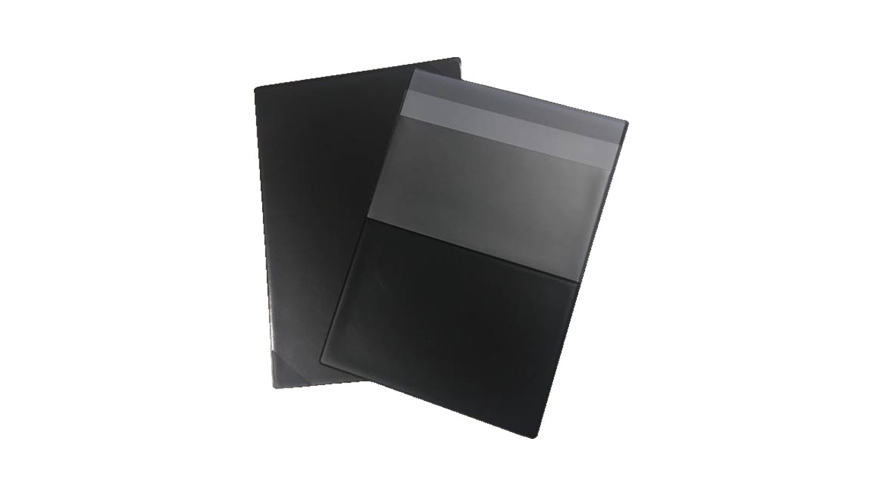 Huoltotasku A4 Kova, taittamaton, musta taustamuovi. Muovitasku aukeaa yhdeltä lyhyeltä ja pitkältä sivulta. Taustan takana A5 muovitasku läpällä