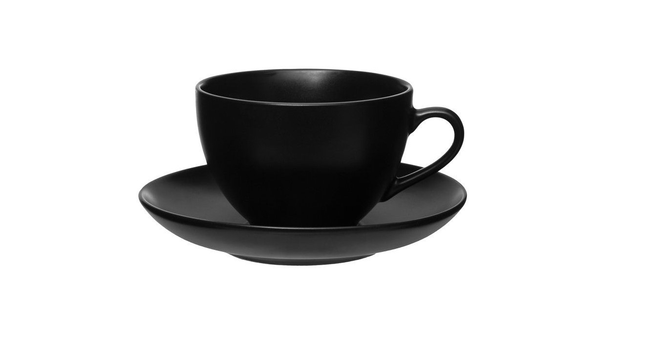 Pelkistetyn tyylikkäät, kauniin muotoiset keraamiset kahvimuki ja aluslautanen sopivat niin arjen kuin juhlankin kattauksiin.