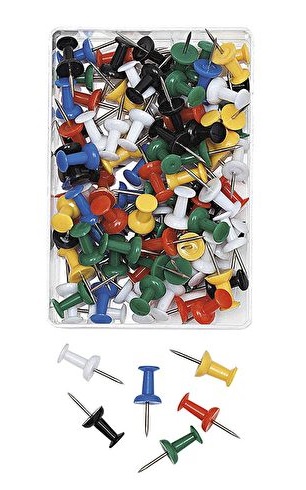 Karttaneuloja eri väreissä muistiinpanojen kiinnitykseen. Neulan pituus: 1,1 cm, halkaisija: 0,9 cm, kokonaispituus: 2,3 cm. Hakusana: nuppineula