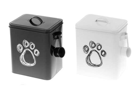 Metallinen ruokapurkki kissan ja koiran kuivaruoalle. Kaksi värivaihtoehtoa, joista jompikumpi valikoituu tilaukselle varastosaldojen perusteella.
