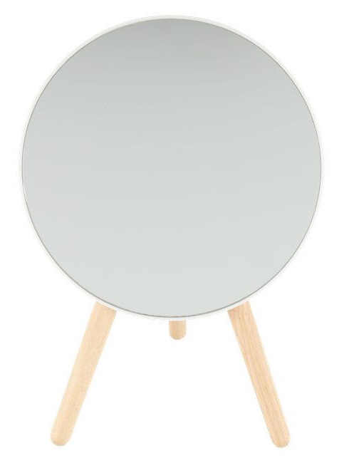 MINEAS Pyöreä peili Tyylikäs pöytäpeili Valkoinen tausta ja puusta valmistetut jalat Mitat: Leveys: 16,5 cm Syvys: 12 cm Korkeus: 23,5 cm