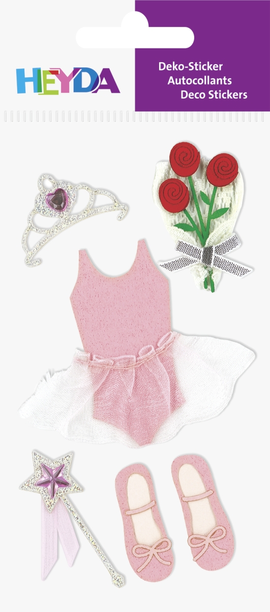 HEYDA Tarra-arkki Ballet. Pahvipohjaiset tarrat sisältävät yksityiskohtaisia koristeita kuten helmiä, nauhoja ja akryylitimantteja.