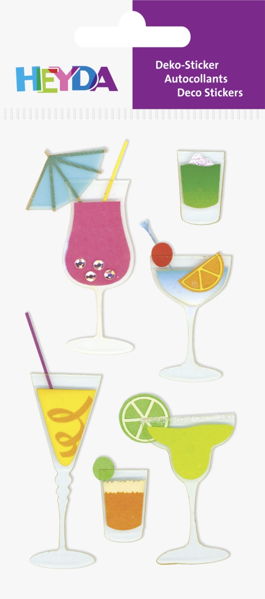 HEYDA Tarra-arkki Cocktailit. Pahvipohjaiset tarrat sisältävät yksityiskohtaisia koristeita kuten helmiä, nauhoja ja akryylitimantteja.