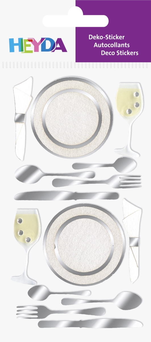 HEYDA Tarra-arkki Illallispöytä. Pahvipohjaiset tarrat sisältävät yksityiskohtaisia koristeita kuten helmiä, nauhoja ja akryylitimantteja.
