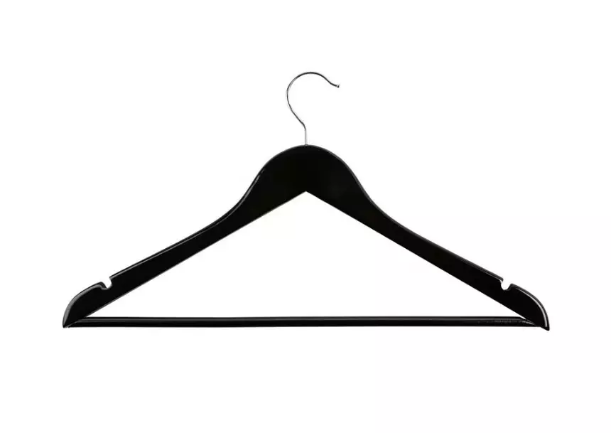 Mustaksi maalattu puinen henkari välipuulla.