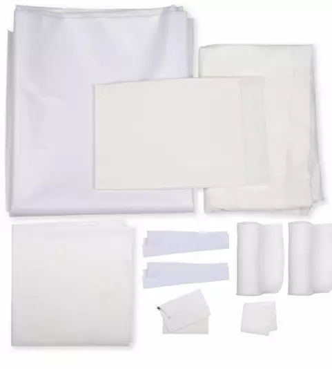 Bea Pro vainajanlaittosetti sisältää vainajalle puettavan paidan, vainajan siirtoon tarkoitetun suojalakanan, kroonikkovaipan mahdollisten eritteiden varalle, kaksi sideharsorullaa käsien/jalkojen ja leuan sitomista varten, kaksi kuitukangastaitosta silmäluomien päälle asetettavaksi, kuitukangasliinan, paperikortin potilaan tietojen kirjaamiseen sekä paperikortin kiinnittämistä varten hakaneulan tai kuitukangasnauhan.