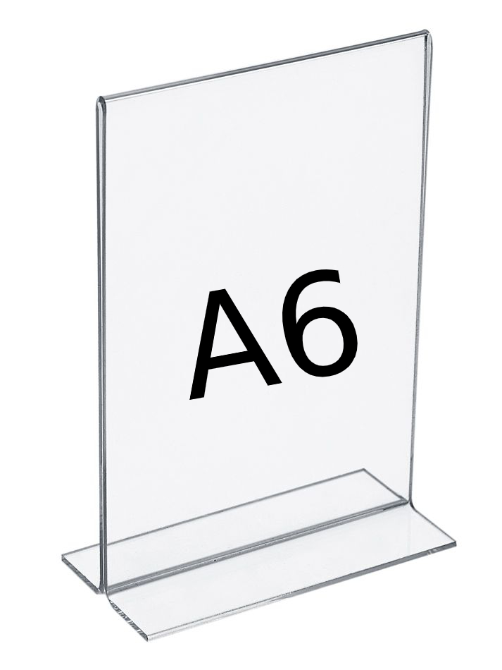 Esiteteline A6 T-malli Valmistettu kikkaasta akryylistä. 1,5 mm paksu akryyli. Mitat: Pituus: 55 mm. Leveys: 105 mm. Korkeus: 152 mm.