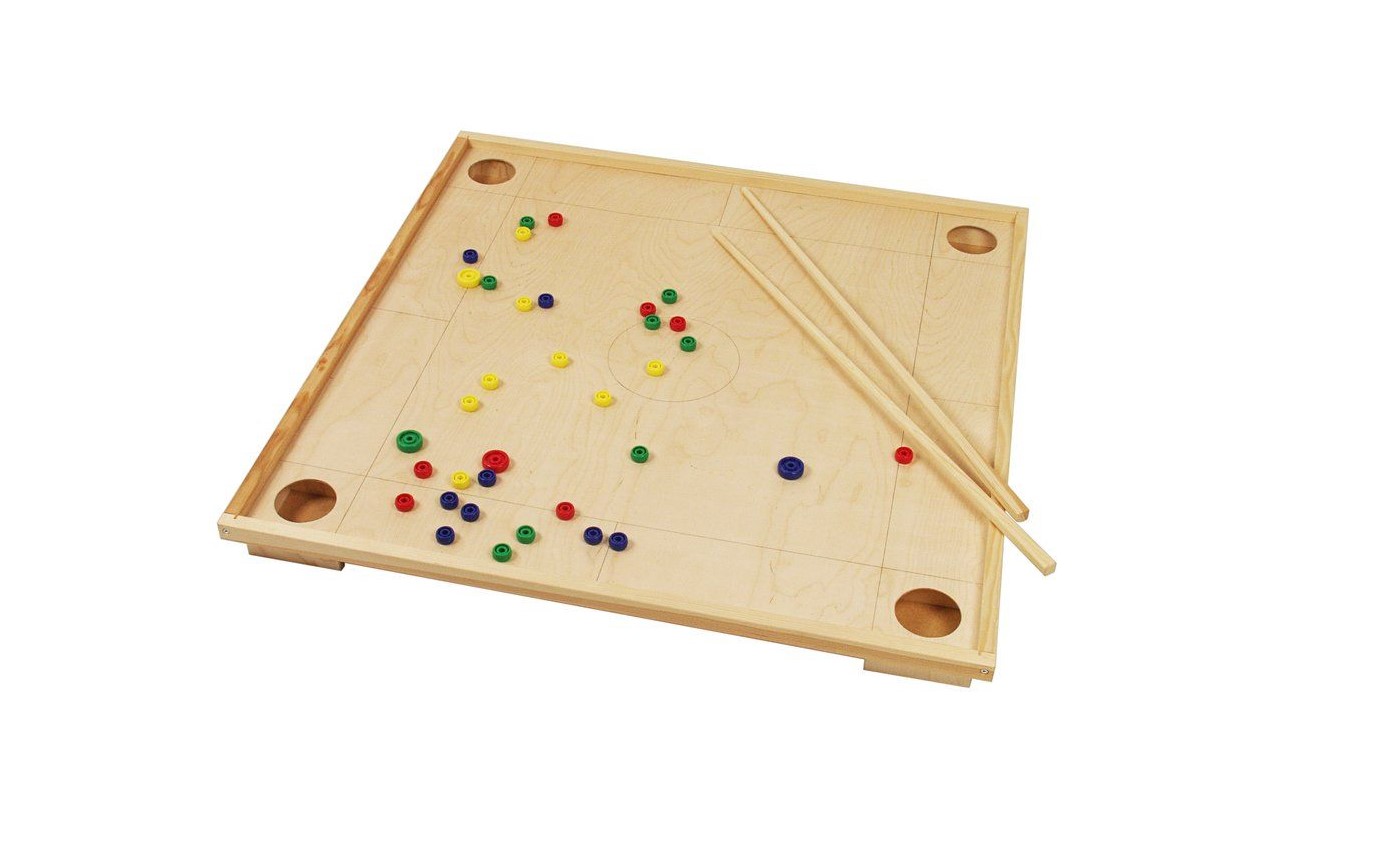 Klassinen koronapeli jännittäviin peli-iltoihin. Pelaajat lyövät kepeillä kiekon muotoisia nappuloita neliskulmaisen pelialueen kussakin nurkassa sijaitseviin purkkeihin.