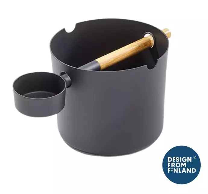 Tässä kauniissa setissä kiulu ja kauha sopivat yhteen saumattomasti. Kauha sujahtaa kiulussa olevista rei'istä ja toimii kiulun kantokahvana. Saunomisen aikana kauhan voi laskea kiulussa olevien lovien päälle.