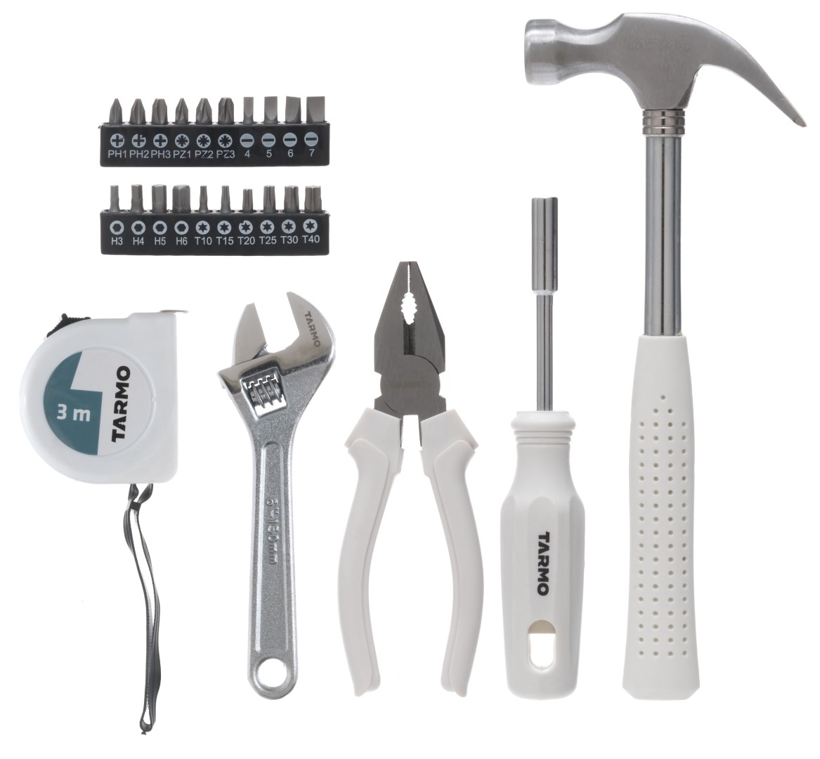 Näppärä työkalupakki sisältää kaiken tarvittavan satunnaisiin tarpeisiin. Tyylikäs valkoinen väri. Työkalujen materiaali hiiliteräs.