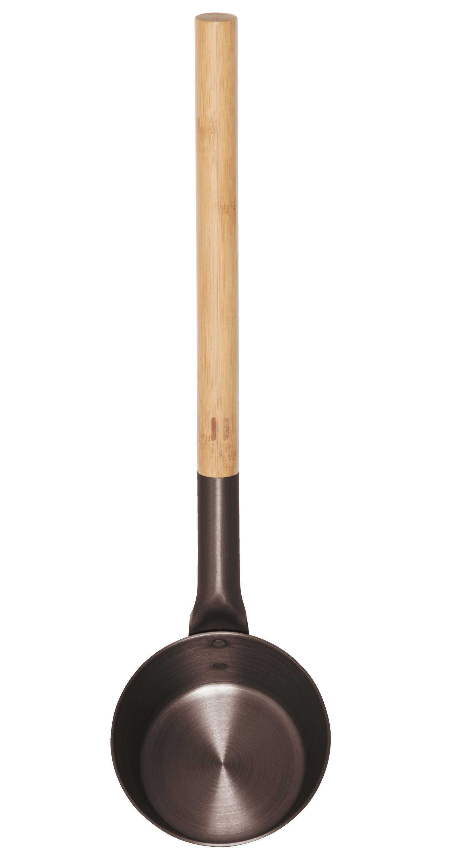 Tyylikäs saunakiulu värilliseksi käsiteltyä alumiinia bambukahvalla.