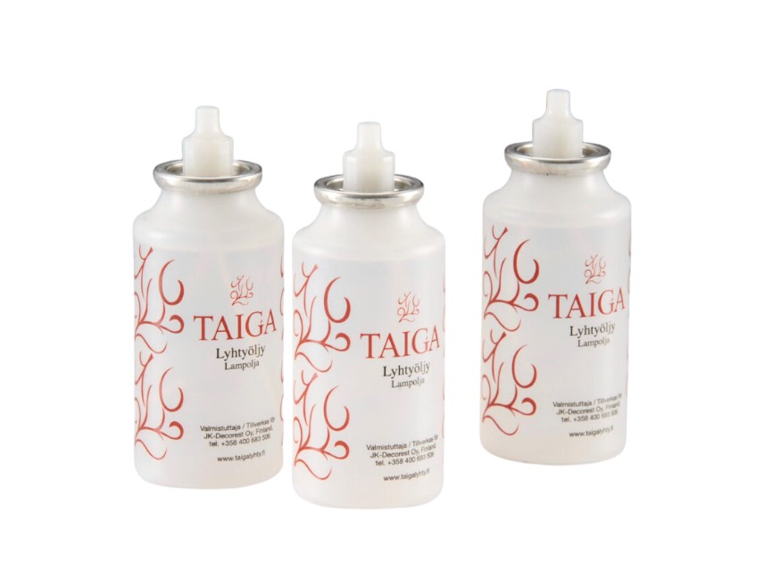 Taigalyhdyn öljy on puhdasta mineraaliöljyä, minkä ansiosta lyhty ei savua eikä nokea ympäristöään. Jos öljyä sattuu läikkymään, se haihtuu aroiltakin pinnoilta jälkiä jättämättä. Öljysäiliö käy kaikkiin kaupastamme löytyviin lyhtymalleihin ja sen paloaika on noin 35-40 tuntia. Voit tilata säiliöitä 20 kpl:n pakkauksissa.