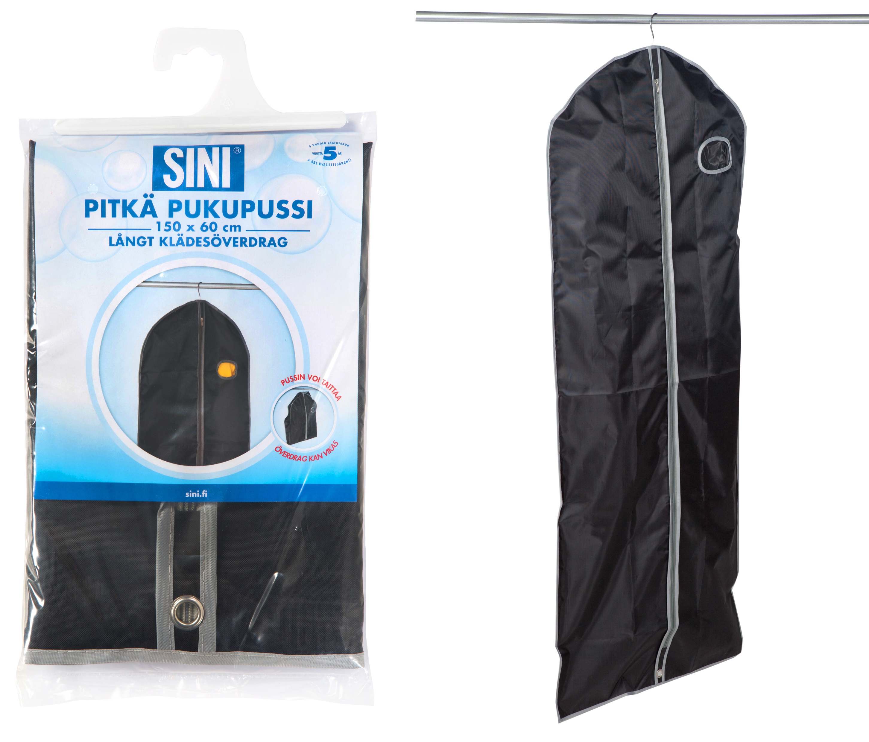 Pitkä pukupussi sopii pitkien takkien ja mekkojen säilytykseen vaatehuoneessa, -kaapissa tai varastossa.