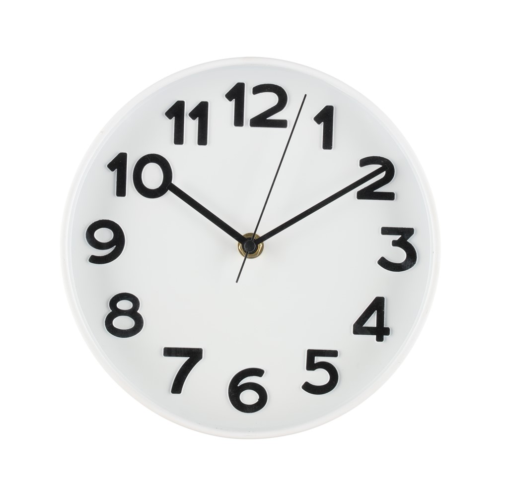 Yksinkertainen valkoinen seinäkello, jossa hiljainen koneisto ja selkeä numerointi.