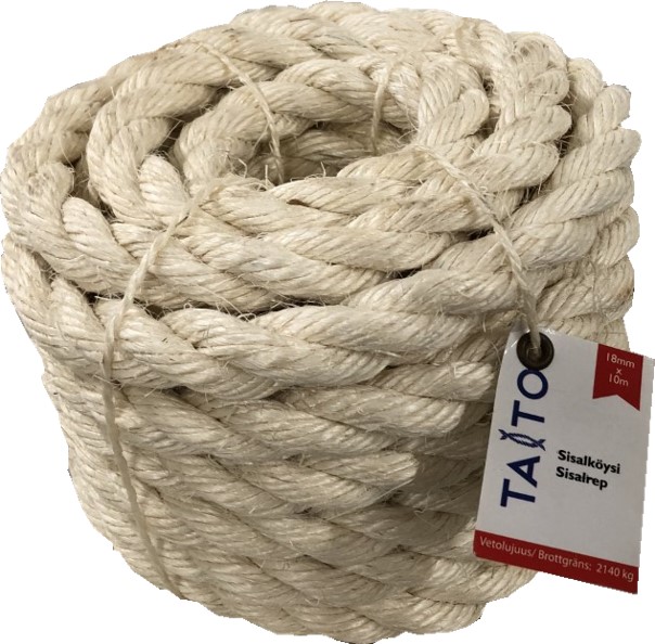 Sisal on 100% luonnonkuitu - materiaali palmun lehtiruoko - erittäin suuri vetolujuus Sisalia voidaan värjätä tai suojata UV-suojalla Sisalkuitu kutistuu ulkokäytössä 10-15% Tuotteen voi hävittää polttamalla Saatavana eriväreissä