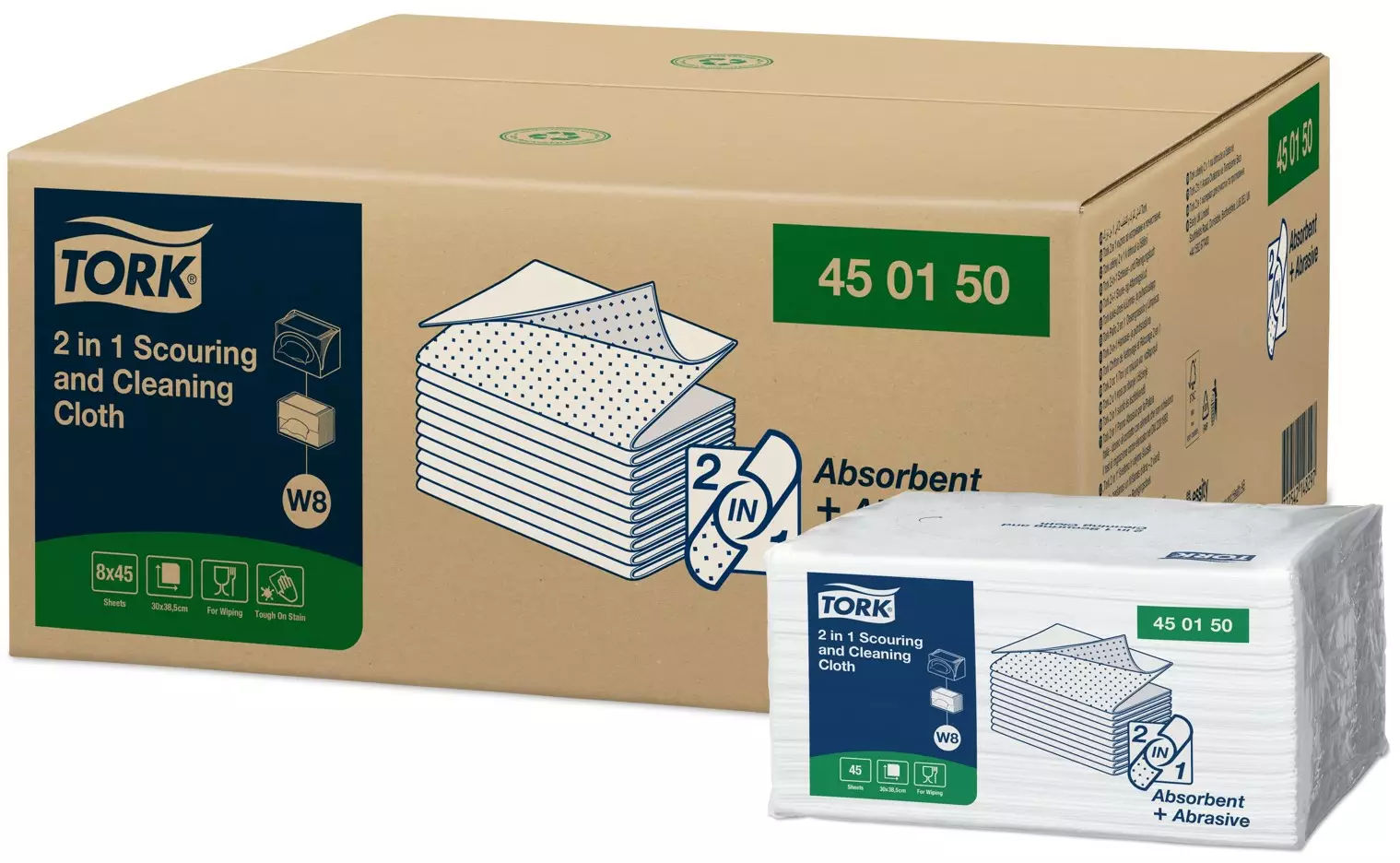 Tehokkaaseen puhdistukseen suunniteltu Tork 2-in-1 hankaus- ja puhdistusliina hankaa ja on samalla imukykyinen. Sopii pinttyneenkin lian puhdistamiseen, esim. ravintoloissa ja keittiöissä, eikä silti naarmuta pintoja. Voit huudella puhdistusliinan ja käyttää sitä uudelleen, ja se sopii käytettäväksi yleisten pesuaineiden kanssa.