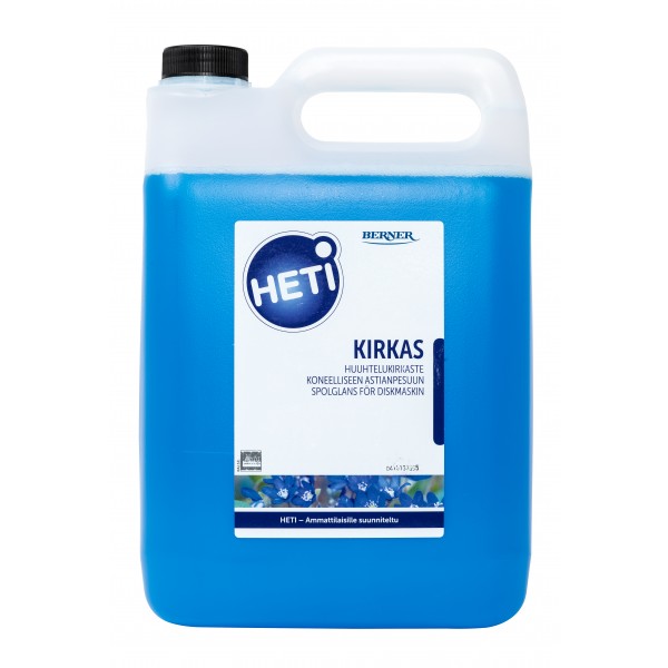 HETI Kirkas on nestemäinen astianpesukoneissa käytettävä huuhtelukirkaste, jonka avulla astiat kuivuvat nopeasti ja jäävät kirkkaiksi.