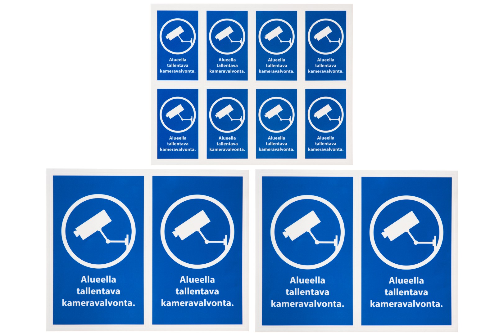 - 3 arkkia erikokoisia kameravalvontatarroja.